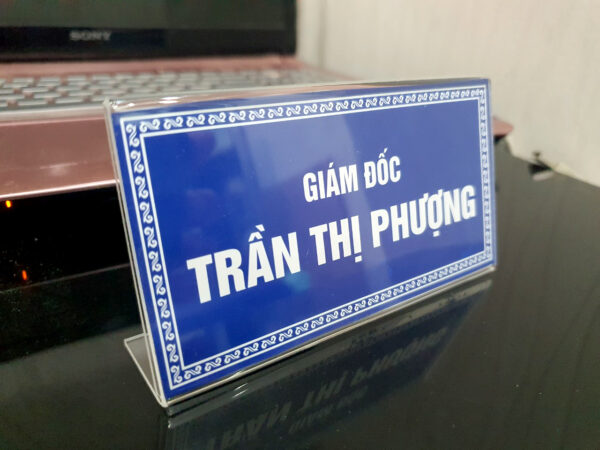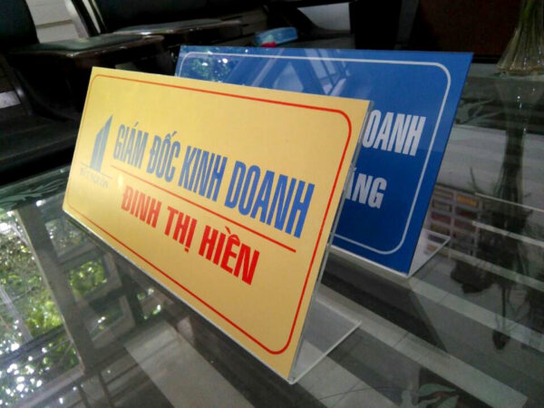 Bảng mica chức danh để bàn sang trọng, thiết kế theo yêu cầu. In tên, logo, chức vụ rõ nét. Nhận làm bảng mica nhanh – giá rẻ – giao toàn quốc.
